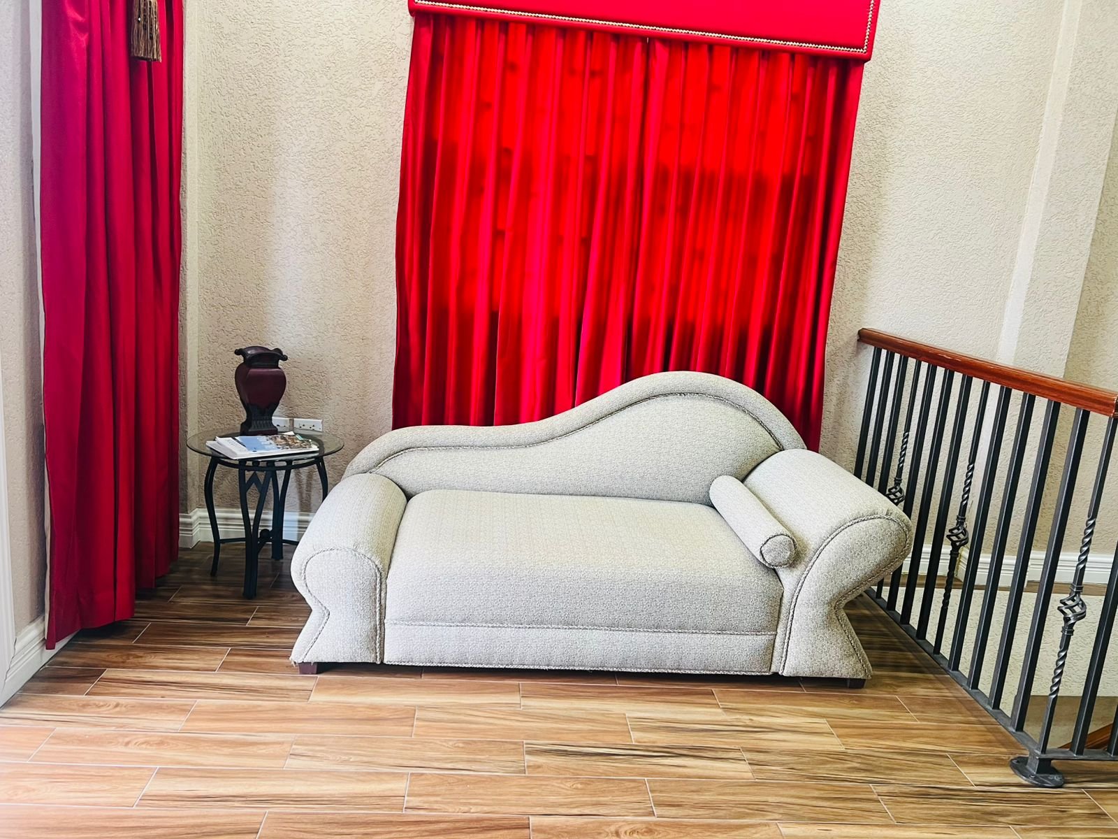 Unique details include an elegant reading chaise lounge and natural wood-look tile flooring.
